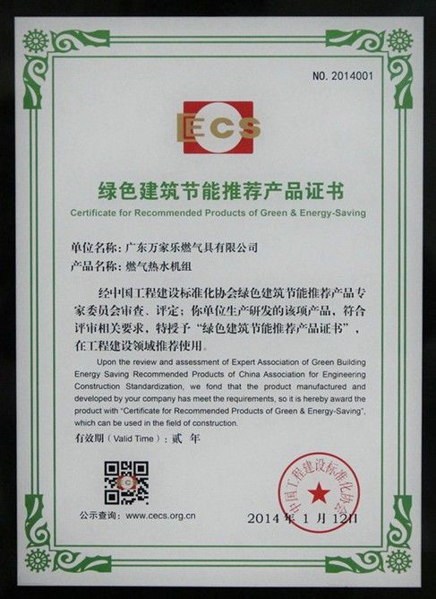 近日,由中国工程建设标准化协会(以下简称“中国建设标协”)与中房信研(北京)节能技术服务中心共同组织开展的《全国工程建设标准技术与产品应用目录》(以下简称“《目录》”)编制及工程建设产品评定推荐活动顺利完成。万家乐燃气热水机组凭借过硬的技术和产品质量,通过评审的相关要求,成功被中国建设标协编制收入《目录》,并荣获“绿色建筑节能推荐产品证书”。